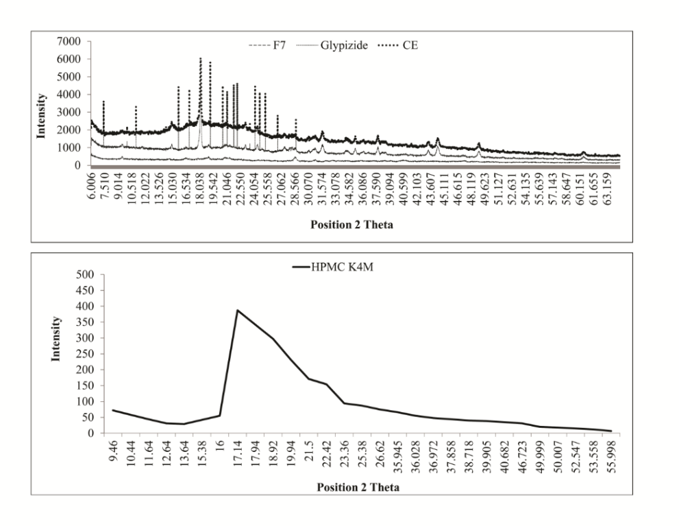 Fig. 4: X-ray diffraction patterns of Glipizide, CE, HPMC, and F7