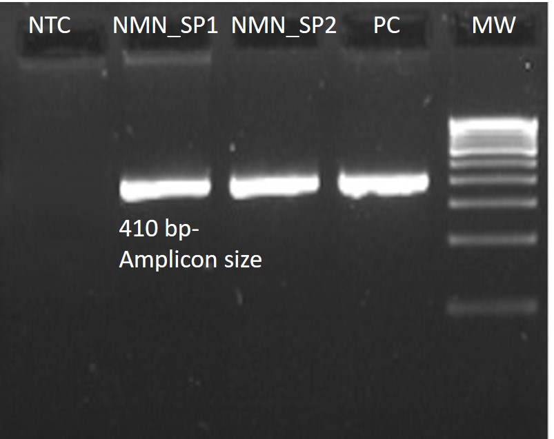 Fig. 1: Agarose gel electropherogram showing positive amplification for two isolates obtained from environmental samples labelled as NMN_SP1 and NMN_SP2. Know Algal DNA used as positive control showed amplification and NTC (Master mix+Nuclease free water as sample) showed no amplification