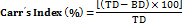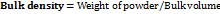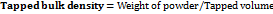 The diameter of the powder cone was measured and angle of repose was calculated using the equation