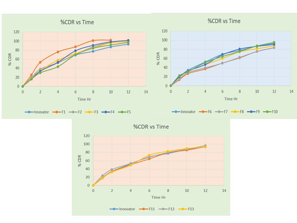 Fig. 5: Comparative dissolution profile of Trial F01 to F013 and Innovator