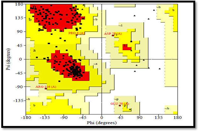 Based on the c-score of the model, the PDB structure was selected. This model was verified by the Ramachandran plot using the PROCHECK server. A two-dimensional plot is used to distribute amino acids in the different conformation of the ψ and φ angles [14].