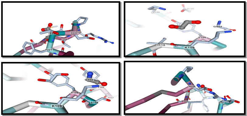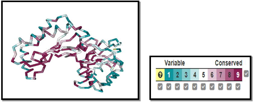 Conserved and variable regions of PMM2 protein were predicted by the ConSurf server (table 3). The R21W, G175R and N216S have a conservation score of 9 and T226S and G228R have 8. All the amino acid residues fall in conserved regions, showing more possibilities to alter the protein structure [21]. The 3D structure and ligand-binding sites present in different conserved regions of PMM2 protein mentioned in fig. 4.