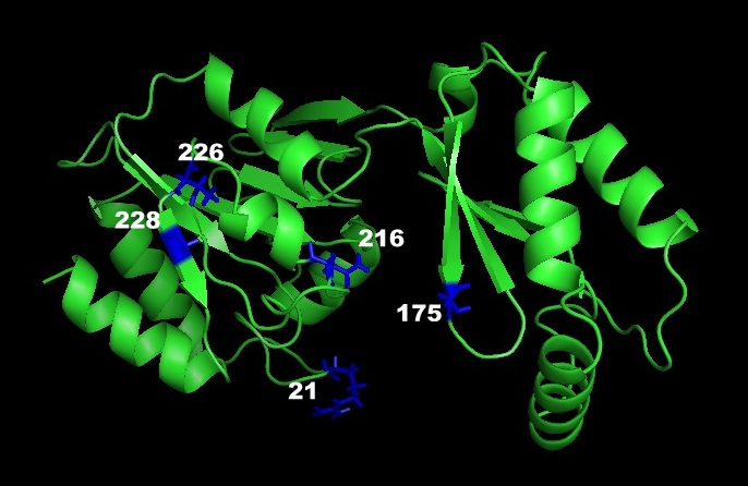 The most stable structure of the protein is used to determine the ligand-binding site of the enzyme. Those SNPs present in the Ligand binding site of PMM2 protein were Arg21, Gly175, Asn216, Thr226, and Gly228. The Asn216 and Arg21 were involved in the binding of Mannose 6 phosphate and Mannose 1 phosphate, which are the substrate of protein glycosylation. These five binding sites are shown in Fig.3. by using pymol. Table 3 shows the results of the COACH server.