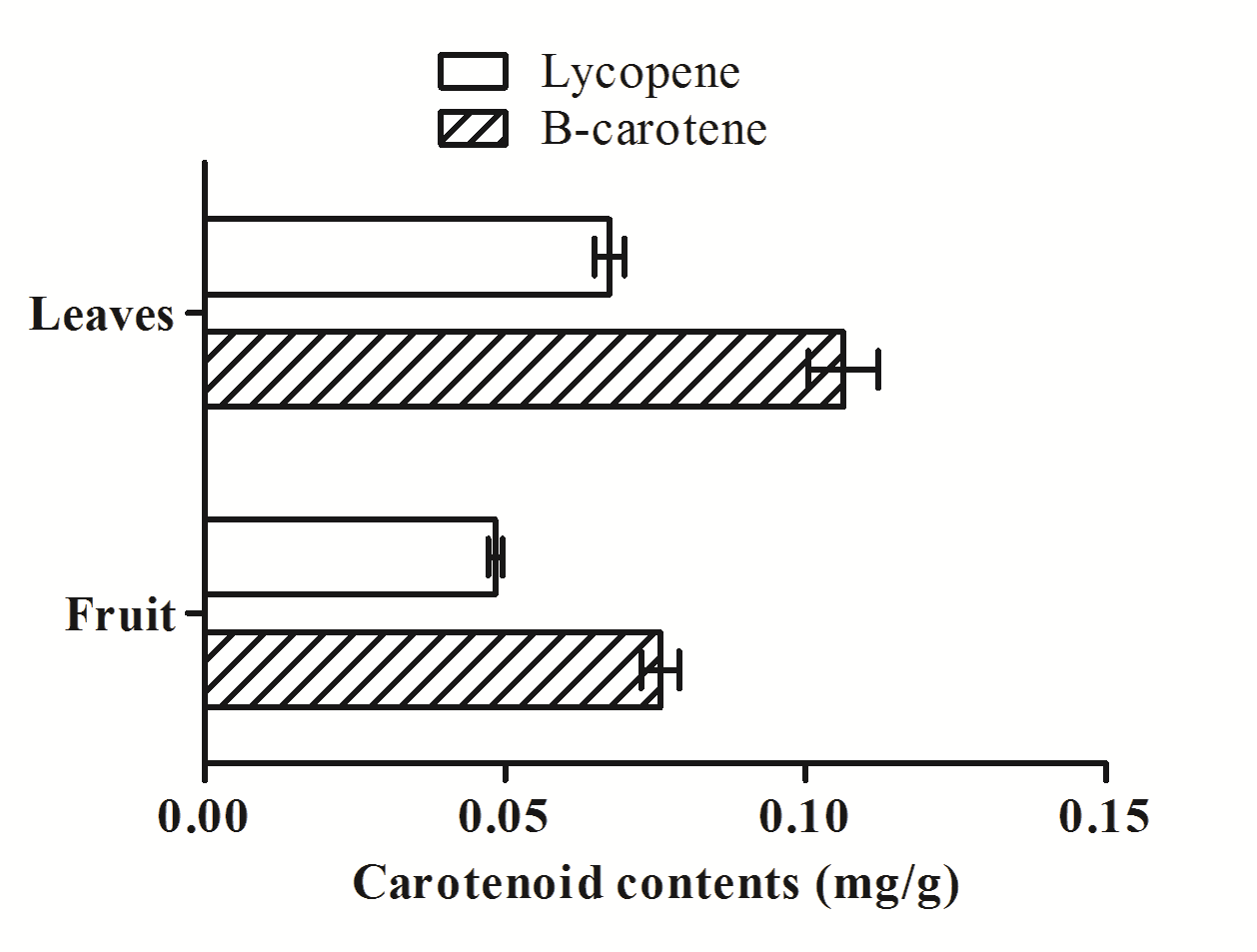 Levels of β-carotene and lycopene in the extracts from fruit and leaves are shown on figure1. High levels of carotenoids content was obtained with hydro-acetonic extracts of leaves (0.106±0.010 and 0.067±0.004 mg / g of dry extract respectively for β carotene and lycopene) compared to the fruit extract (0.076±0.006 and 0.048±0.002 mg/g of dry extract respectively for β carotene and lycopene).