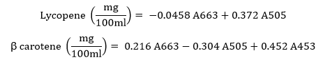 Levels of β-carotene and lycopene in extracts of fruit and leaves of Lannea microcarpa were determined by the method described by Barros et al. [21]. 100 mg of lyophilized extract were dissolved in 10 ml of a mixture of acetone and hexane (4:6). The resulting solution is stirred vigorously for 1 min, and filtered through a membrane filter (Whatman paper No. 1). The absorbance of the filtrate was measured with a spectrophotometer, at wavelengths of 453, 505 and 663 nm. The contents of the extracted β-carotene and lycopene were calculated by using the following equations: