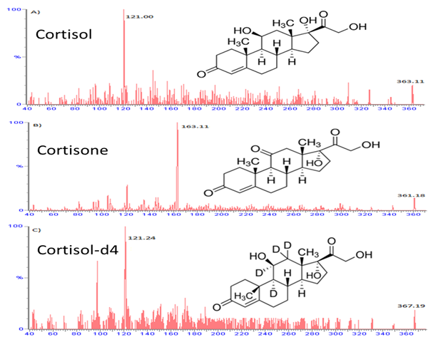 Fig. 1: MS/MS spectrum and chemical structures of cortisol, cortisone, and cortisol-d4 (internal standard)