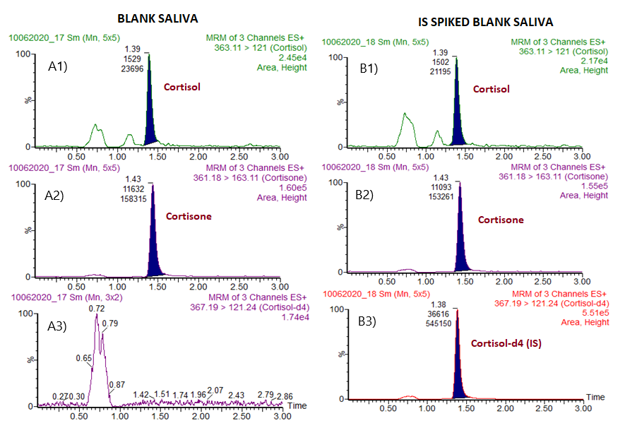 Fig. 2: Chromatogram of multiple-reaction-monitoring of human saliva used to prepare quality controls. Blank saliva (A1-A3). Blank saliva spiked with internal standard (B1-B3)