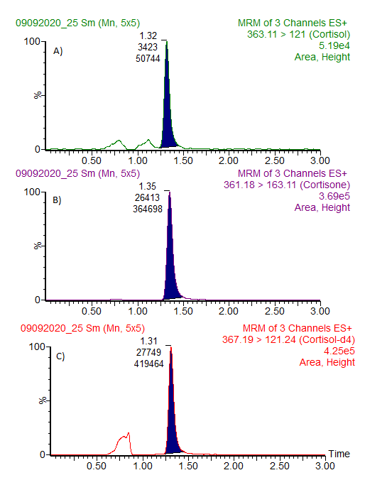 Fig. 3: Multiple-reaction-monitoring chromatogram of saliva sample collected from healthy volunteer spiked with IS (20 ng). Measured level of A) Cortisol (2.4 ng/ml) B) Cortisone (26.7 ng/ml) and C) Cortisol-d4 (IS)