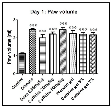 Conclusion: Topical caffeine gel (3% and7%) shows more significant anti-inflammatory effect as compared to oral caffeine solution (20 mg/kg and 50 mg/kg).