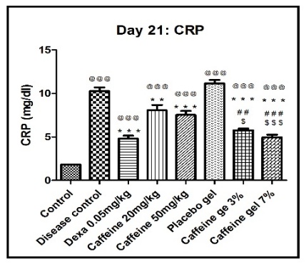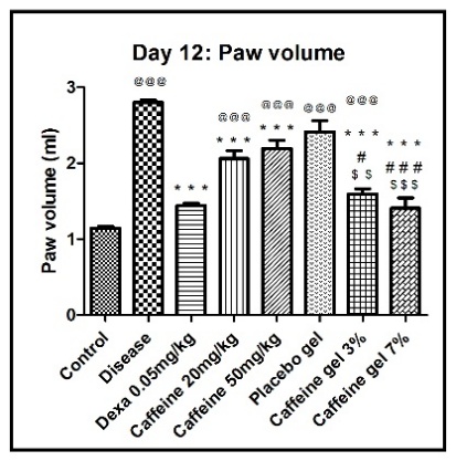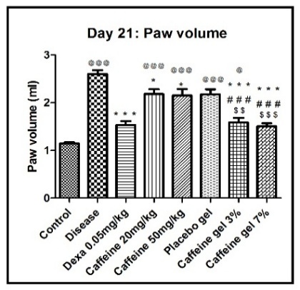 Results: CFA showed significantly (p < 0.001) higher paw volume, CRP, RF and arthritic index as compared to caffeine 20 mg/kg, caffeine 50 mg/kg, caffeine gel 3% and caffeine gel 7% treated animals. It was observed that topical caffeine gel (3% and 7%) suppressed paw volume, CRP, RF and arthritic index in a more statistically significant manner compared to oral caffeine solutions (20 mg/kg and 50 mg/kg).