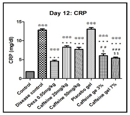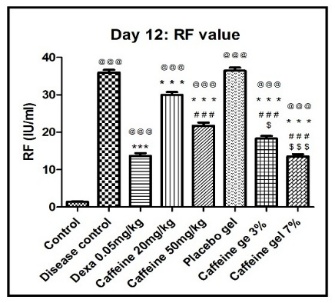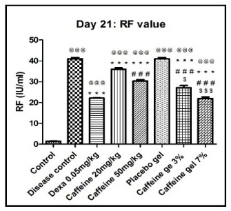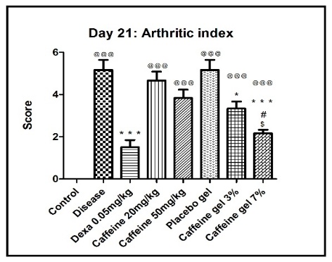 Caffeine 20 mg/kg and caffeine 50 mg/kg also showed reduction in paw volume, CRP and RF value but no statistical significance on day 12 and day 21. Similar results were also observed in case of caffeine gel 3% and caffeine gel 7% where both showed no statistical significance in paw volume reduction on 12th and 21st day. Statistically significant difference was observed in between oral caffeine solutions (caffeine 20 mg/kg, caffeine 50 mg/kg) and caffeine gels (Caffeine gel 3%, caffeine gel 7%) on day 12th and day 21st. When topical caffeine gels (caffeine gel 3%, caffeine gel 7%) were compared with oral caffeine solutions (caffeine 20 mg/kg, caffeine 50 mg/kg) for scoring of arthritic index on day 21, topical caffeine gels (caffeine gel 3%, caffeine gel 7%) showed statistically significant reduction in arthritic index than caffeine solutions (caffeine 20 mg/kg, caffeine 50 mg/kg).