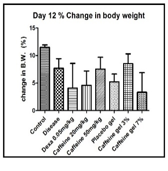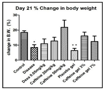 After approval from Institutional Animal Ethics Committee (IAEC), 48 female wistar albino rats weighing 150-210 g were used for the study. Animals were randomly divided into 8 groups (n=6) like control (Group I), disease control (Group II, distilled water), dexamethasone 0.05mg/kg, p. o treated (Group III), caffeine 20mg/kg, p. o. treated (Group IV), caffeine 50 mg/kg, p. o. treated (Group V), placebo gel (Group VI), caffeine gel 3% treated (Group VII) and caffeine gel 7% treated (Group VIII). Arthritis was induced in all animals by sub plantar injection of Complete Freund’s adjuvant 0.1 ml in sub plantar region of left hind paw. Drugs were administered from day 0 to day12. Changes in paw volume (on day 0, 1, 12, 21), CRP (on day 0, 12, 21), RF (on day 0, 12, 21), arthritic index (on day 21) and percentage change in body weight (on day 12, 21) were measured to evaluate the efficacy of different treatments.