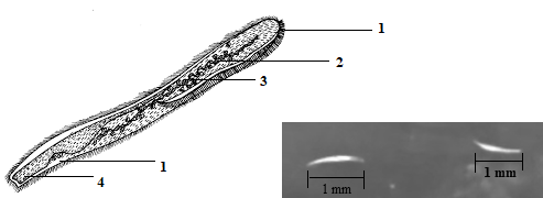Fig. 1: The general features of Sp. ambiguum ciliates: 1–peristom; 2–large macronucleus; 3–small micronuclei; 4–reducing vacuole; in the insert–a light microscope image of Spirostomum ambiguum in real laboratory settings [22]
