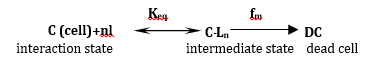 Where °bsfm is the observed rate constant of the cell transition to the dead state (cell death rate), Keq represents the equilibrium constant, [L] is the xenobiotic concentration and n-stoichiometric coefficient in kinetic scheme (fig. 2).