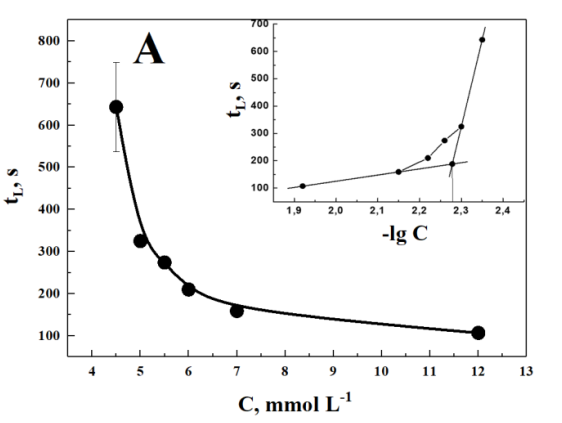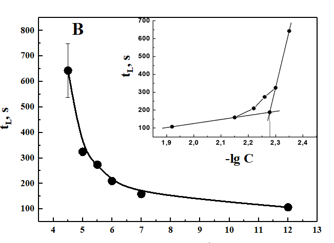 Fig. 5: Dependence of cellular biosensor lifetime on the concentration of water solutions of glycolic (A) and carbolic (B) acids; n=5; p<0.001. The inset shows the dependence tL=f (lgC)