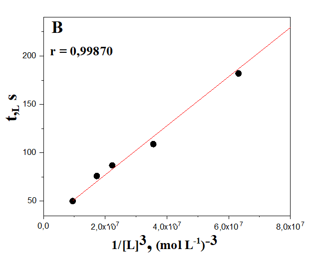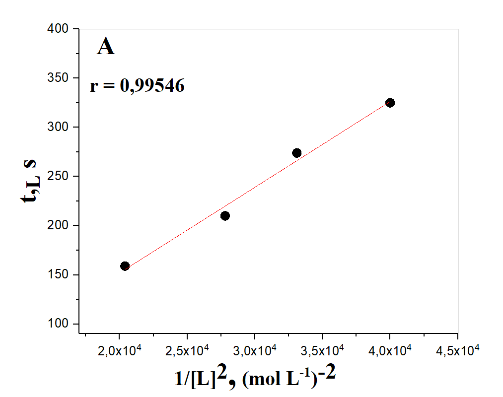 The straight line of the dependence tL = F(1/[L]n) makes it possible to determine the values of the death rate fm= 1/tL at the ordinate intersection and the equilibrium constant of the formation of the intermediate complex Keq at the abscissa intersection with an appropriate choice of stoichiometric coefficient n [32-36]. Calculations have shown that for glycolic acid n = 2 and for carbolic acid n = 3. The linearization of the experimental results in the indicated coordinates at other values is less reliable (fig. 6, table 1). Thus, the using kinetic model describes the mechanisms of ligand-receptor interaction of the xenobiotics with the living cell.