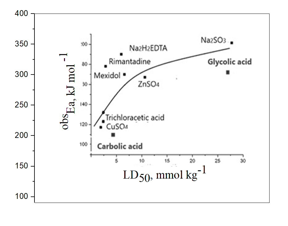 As would be expected, there is a high correlation between the values of the apparent activation energy and LD50 (rats, per os) of chemical peeling substances and other pharmaceuticals [41].