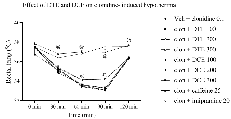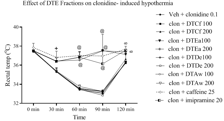 Results: DTE 200 DTE 300 has significantly inhibited clonidine-induced hypothermia. Among the fractions tested, DTE fraction-DTEa 100 and 200 and DCE fractions DCDe 200 and DCAw 200 significantly (p<0.0001) reversed clonidine-induced hypothermia; the effect of DTEa was found to be more sustained.