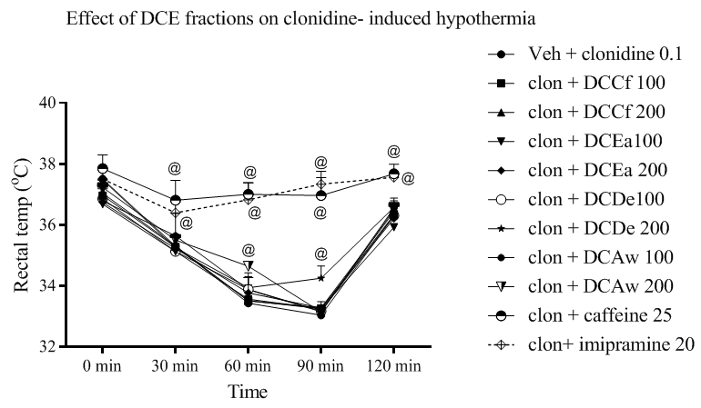 Methods: Clonidine (0.1 mg/kg, i. p.) administered to a group of mice pretreated 30 min before with the dose of DTE or DCE or their respective fractions. Rectal temperature was measured at the time of clonidine administration and thereafter at every 30 min up to 2 h test period.