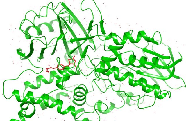 Fig. 1: Crystallographic structure of MAO-B with co-crystallized ligand (red) [18]