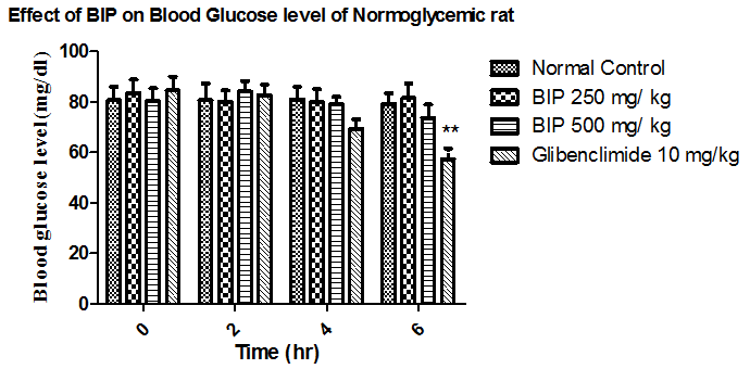 In normoglycemic rats, BIP at both two doses ie. 250 and 500 mg/kg orally did not reduce the plasma glucose levels in rats. However, the rats treated with glibenclamide 10 mg/kg showed a reduction in glucose level (P<0.01) at 6 hr post administration. (fig. 1)