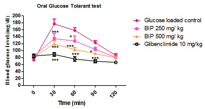 Administration of BIP at both doses 250 and 500 mg/kg orally half an hour prior to glucose load showed improved glucose tolerance in normal rats. Maximum effect was observed at 30 min after the glucose load in rat treated with BIP 250 mg/kg (P<0.001) while in case of BIP 500 mg/kg, maximum effect was observed 30-60 min after glucose load (P<0.001). Glibenclamide (10 mg/kg) showed a significant (P<0.001) decrease in plasma glucose levels up to 90 mins. (fig. 2)