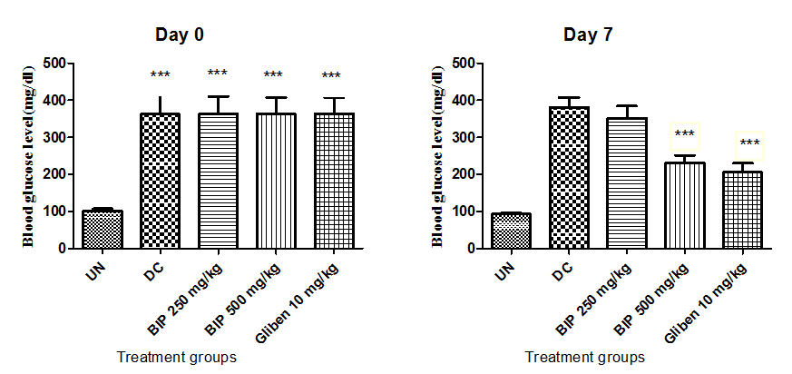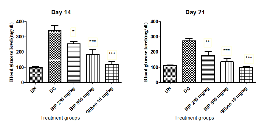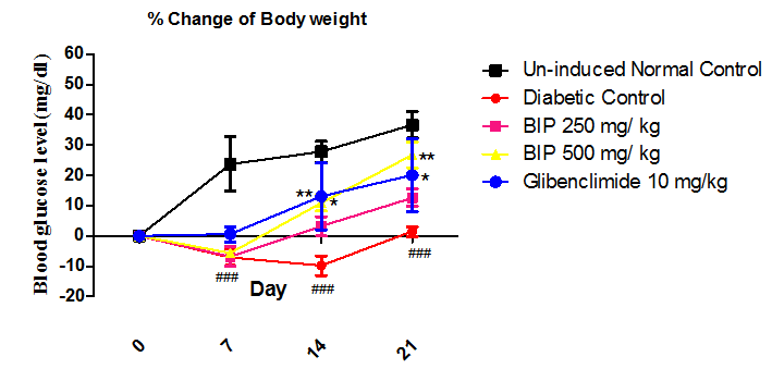 On Day 0, Blood glucose level of the all diabetes induced group was found to be the groups 362-365 mg/dl and was significant (p<0.001) over un-induced normal control. It represents uniform randomization of diabetic animals across the experimental group at the start of the study. BIPtreatments at 250 mg/kg and 500 mg/kg showed dose-dependent reduction of elevated blood glucose level. BIP 250 mg/kg showed significant reduction on day 14 (P<0.05) and Day 21(P< 0.01) while BIP 500 mg/kg treatment showed significant(P<0.001) reduction of blood glucose on Day 7, on Day 14 and on Day 21. Blood glucose reduction by standard drug Glibenclamide 10 mg/kg was significant (P<0.001) on all the days.
