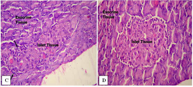 The decrease in these antioxidants leads to excess availability of hydrogen peroxides and superoxide anion in the biological system, which generates hydroxyl radicals, resulting in initiation and propagation of lipid peroxidation. The results of increased activity of catalase and glutathione suggested that BIP possess free radical scavenging activity. Histopathological study finding of pancrease indicates that Diabetic animals showed small Islet with several lymphocytes seen in the peripheral portion of the Islet. On other hand, BIP treatment protects from islet destruction and reduces the lymphocytes infiltration.