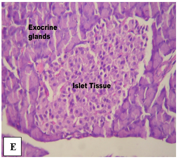 A: Pancreas of un induced Normal rat. Pancreas of rat from uninduced Control Group is showing a normal architecture of the pancreatic tissue. There is no lymphocytic infiltration seen in or around the Islet, B: Pancreas of Diabetic Control rat. Pancreas from an STZ treated diabetic control group rat is only showing a small Islet with several lymphocytes seen in the peripheral portion of the Islet, C: Pancreas of rat administered BIP at a dose of 250 mg/kg b. w. also showing a relatively larger islet with several Insulin producing beta cells. Lymphocytic infiltration is seen at the upper and lower margins of one end of the Islet, D: Pancreas of rat administered BIP at a dose of 500 mg/kg b. w. showing a relatively larger islet with several Insulin producing beta cells. A single layer of lymphocytic infiltration is seen around the Islet cells, E: Pancreas from Glibenclamide 10 mg/kg Treatment Group. Pancreas of rat administered Glibenclamide 10 mg/kg b. w. is showing complete recovery form necrotic damage and large Islet. There is very less lymphocytic infiltration seen in or around the Islet