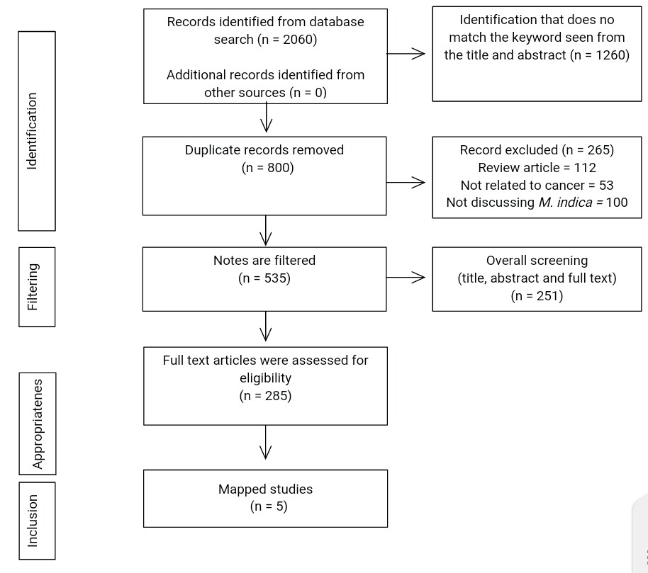 A comprehensive search was carried out by collecting publications from several databases, i.e., Cochrane Library, Google Scholar, PubMed, ProQuest, ScienceDirect, and the Wiley Online Library. The keywords used were "(cancer) AND (mangiferin) AND (immunomodulator)." The literature used is an article published in the last ten years. Fig. 2 showed the flow chart of this systematic review.