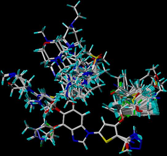 The most active compound (compound no: 14 according to the literature) used as template and the remaining 99 samples aligned to it through using the basic core structure(5-(1H-benzimidazole-1-yl) thiophene-3-ol) and the alignment of all the molecules shown in fig. 1.