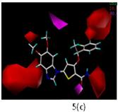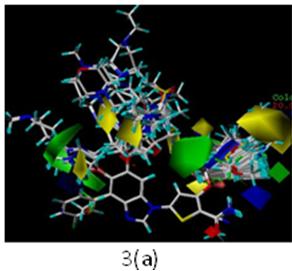 According to CoMFA steric field contour map,green colored polyhedral represents the area where a steric bulk substituent enhances the potency; while yellow colored polyhedral represents the area where a steric bulk substituent decreases the potency. Whereas the electrostatic field contour map, red colored polyhedral represents the area where electron negativity (substituent) enhances the potency; while blue colored polyhedral represents the area electron positivity (substituent) will enhance the potency. The contour maps of steric and electrostatic fields of CoMFA are illustrated in following fig. 4(a) and (b).