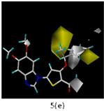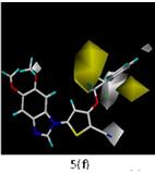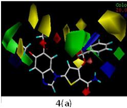 The highly active compound (mol: 14) used for suggesting the favorable systematic requirements of the next-generation lead molecules, based on above 3D-QSAR analysis. “O” attached to thiophene ring substituted methyl & 6th position of thiophene substituted phenyl ring is selected for new structural requirements. The novel lead molecules and the predicted biological activities listed in the table 3, which was validated by molecular docking and found to be more potent than previous molecules.