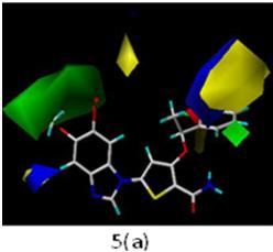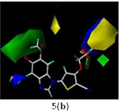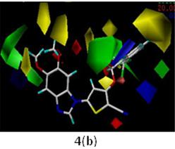 According to the literature [20-22], 5th and 6th positions in Benzimidazole ring of the scaffold having effective steric contribution for the biological activity of the molecules that is clearly supported by the present 3D-QSAR studies. In31 and 32 numbered molecules where pyridine was substituted, at 5th and 6th positions benzimidazole showing effect on their activity. For 13-49 compounds, 13, 16 and 32 compounds not have that much biological potency for sterically bulk groups.