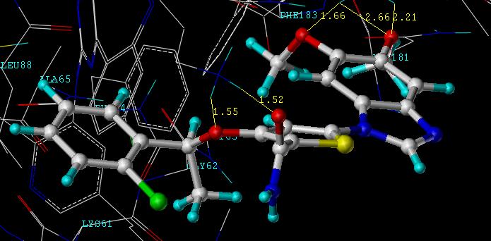 Molecular Docking also well supported the 3D-QSAR analysis with better docking scores having good interactions with the predefined active site. Docking score and interactions based on RMSD having low energy conformation was listed in the Table: 2(a&b). The highest active molecule shows good results when compared with the least active molecule. Highest active molecule shows interaction withPhe183 and Cys133 with distance 1.66, 2.66, 2.21 and 1.55, 1.52 respectively. While reference molecule 3THB shows interactions with Cys133 and Asp194. Were represented in fig. 6.