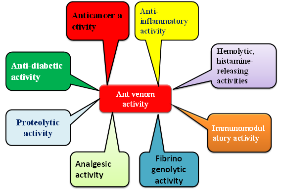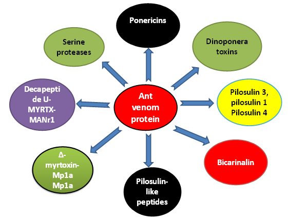 Ants represent a taxonomically diverse group of hymenopterans (formicidae) with over 13,000 extant species, the majority of which inject or spray secretions from a venom gland. Ants is mostly due to the unique eusociality that has permitted them to develop complex collaborative strategies, partly involving their venom secretions, to defend their nest against predators, microbial pathogens, ant competitors, and to hunt immobilize or kill prey for food, Ant venom contains a range of activities including antimicrobial, haemolytic, cytolytic, paralytic, insecticidal and pain-producing pharmacologies. Worker ants generate about 1.17 µg/day. Ant venom toxins can be used to generate bioinsecticides and therapeutic agents [1]. Members of sixteen ant families possess stinger and inflict toxic venom for defense against predators, competitors and microbial pathogens, as well as for social communication (fig. 1). Hymenoptera venoms, mainly ants secrete natural toxins which could be used to synthesize novel therapeutic agents. Ant secretes toxic venom that shows diverse bioactive molecules. Ant Odontomachus bauri crude venom presents several protein bands, with higher staining for six proteins with gelatinolytic activity venom showed high proteolytic activity on azocasein at optimal pH 8.0 and 37 °C. The South American giant ant, Dinoponera quadriceps produces proteinaceous venom. Its toxins are polycationic linear toxins which show multiple biological activities such as antinociceptive, neuroprotective and antimicrobial effects. Ant venom is also used for the treatment of asthma, rheumatism, earache and back pain. Venom from D. quadriceps shows anticoagulant antiplatelet and anti-inflammatory activities [2].