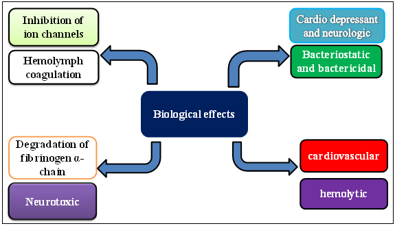 The predatory giant ant Dinoponera quadriceps secretes a complex mixture of bioactive peptides in its venom. It contains five classes’ e. g., dermaseptin-, defensin-, ICK-, pilosulin-and ponericin-like antimicrobial peptides [31]. Its synthetic templates sDq-2562 and sDq-3162 are ponericin-like dinoponera toxins. The most effective peptide, the 28-residue sDq-3162 displayed a significant bacteriostatic and bactericidal effect with minimal inhibitory concentrations. Similarly, venom peptide bicarinalin, from the ant Tetramorium bicarinatum, shows strong antimicrobial activity with a broad spectrum of activity against Helicobacter pylori [32]. Bicarinalin can significantly decrease the density of H. pylori on gastric cells. It shows both curative and preventive use. Bicarinalin shows low cytotoxicity against human lymphocytes at bactericidal concentrations and its long half-life in human serum [33] (fig. 4). Bicarinalin broad antibacterial activity was much similar in magnitude o Melittin and other hymenopteran antimicrobial peptides such as pilosulin or defensing [34] In addition, the venom showed antimicrobial activity against Staphylococcus aureus and Escherichia coli as well as anti-parasitic activity on Toxoplasma gondii infection in vitro [35] (fig. 4).
