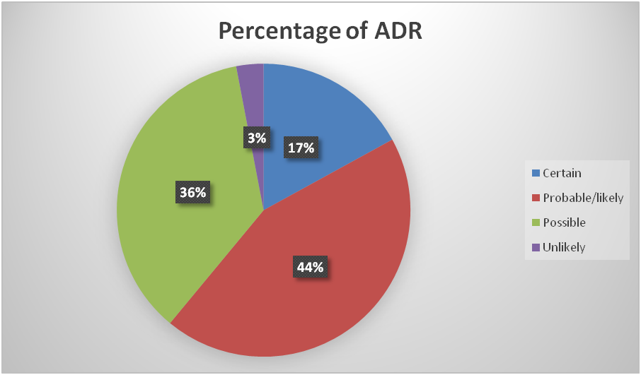 In the WHO-UMC scale for assessing ADRs categories like certain, probable, possible, unlikely, unclassified, and unclassifiable were considered. Based on that, 44% were probable, 36% possible reaction, 17% were certain and 3% were unlikely, which is similar to other studies conducted by BJ M K et al. [19].