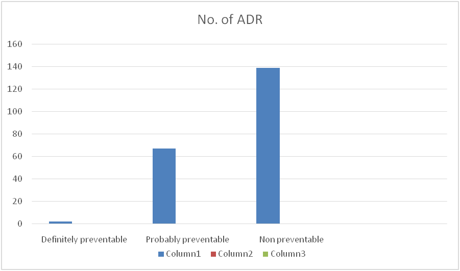 Schumock and Throton scale was established for assessing the preventability of ADR. Using this scale, 66.82% were classified as non-preventable, 32.2% were probably preventable and 0.96% were definitely preventable (fig. 3).