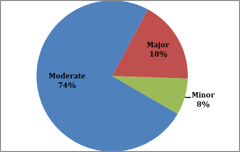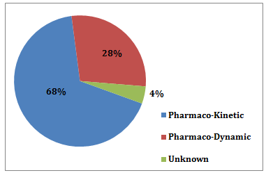 On analyzing the mechanism of drug interaction, pharmacokinetics type of interactions (67.37%) was found to be in greater number compared to pharmacodynamic drug interactions (28.36%) followed by the interactions of unknown mechanism (4.25%). This finding was found to be similar to the study findings conducted. On account of severity assessment of the reactions, the majority of the reactions were categorized as moderate (74.46%), followed by major severity (17.73%). The finding was similar to a study conducted.
