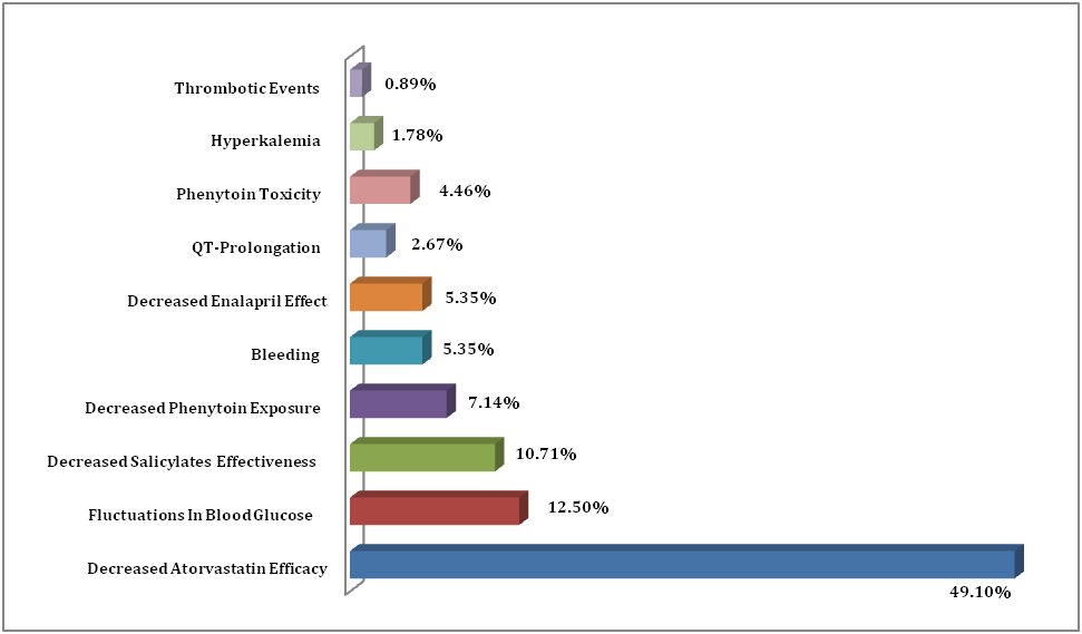 Fig. 4: Bar graph showing various clinical consequences occurring due to DDI’s, Among the various clinical consequences, decreased atorvastatin efficacy (49.10%) was found to be the highest