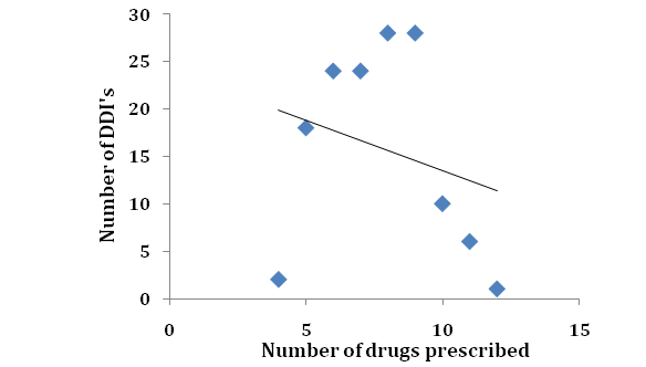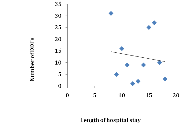 A strong inverse correlation was found between the length of hospital stay and DDIs (r =-0.237, p-value is = 0.29604). The similar significant negative correlation was also found between the number of medicines prescribed and DDI’s (r =-0.264, p-value = 0.0301).