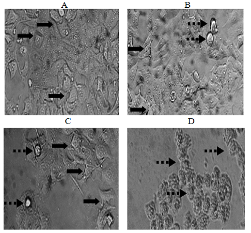 Fig. 2: MCF-7/DOX cells morphology after 24 hours brazilein treatment, control cell (A); brazilein 25 µM (B); Doxo 1 µM (C); Brazilein 25 µM + Doxo 1 µM (D) normal cell morphologymorphology cell changing