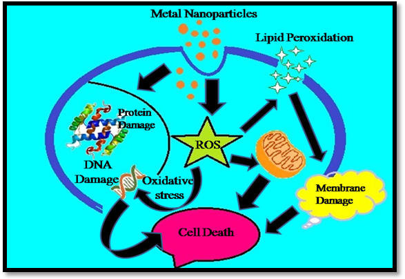 The most effective determinant for both in vitro and in vivo cytotoxicity of ROS, Nanomaterials is believed to be, by the disruption of the respiratory chain itself or directly induced by the Nanomaterials [28]. A burst of ROS occurs through severe oxidative stress, causing damage to all the brain cells, thereby prohibiting lipid peroxidation, protein changes, enzymes and RNA and DNA damage. In high doses, ROS leads to cell death and low dose, causing severe DNA damage and mutations [29, 30]. In some cases, where ROS production is visible or induced by UV light [31] NM poisoning is photocatalytic, for example as show in table 1, TiO2 nm was induced under almost-UV light, lipid peroxidation, which was E. coli leads to respiratory disease and death of cells [32]. Several other effects of nanomaterials include direct inhibition of specific essential enzymes, induction of nitrogen reactive species [NRS] [30, 12, 15, 16] and induction of programmed cell death [31].