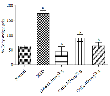 This is the source of the increase in body weight. Rat is consuming the high fat diet actually received about more kilocalories, more weight, and had larger fat pads than rats fed only chow. Our results showed a significant decrease in food intake, whole body weight, and adipose tissue accumulation from oral administration of CaEe 400 mg/kg b. wt. (tables 2 & 3).