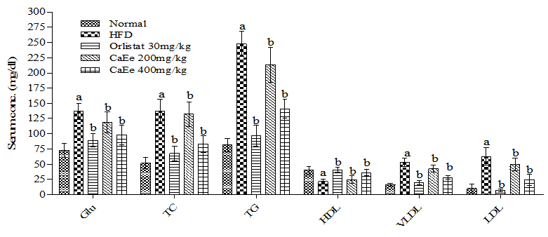 Fig. 2: Effect of various doses of Cassia auriculata leaves ethanol extracts on HFD-induced changes on random serum glucose and lipid profile on Day 84. All values are represented as mean±S. E; a = P<0.01vs Normal Chow Diet control, b = P<0.01vs