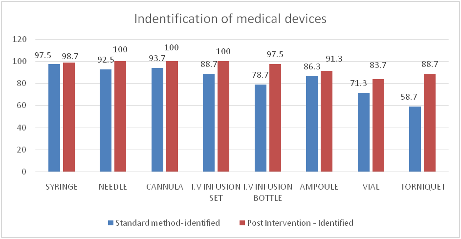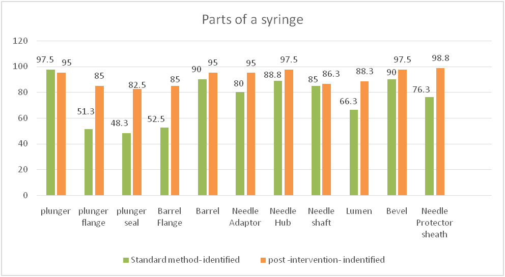 An upsurge in the knowledge of identifying different medical devices and their parts post-intervention could not be compared with other studies since this was the first time that anyone had studied the knowledge about identification of medical devices, parts of IV set and parts of a syringe among medical undergraduates.