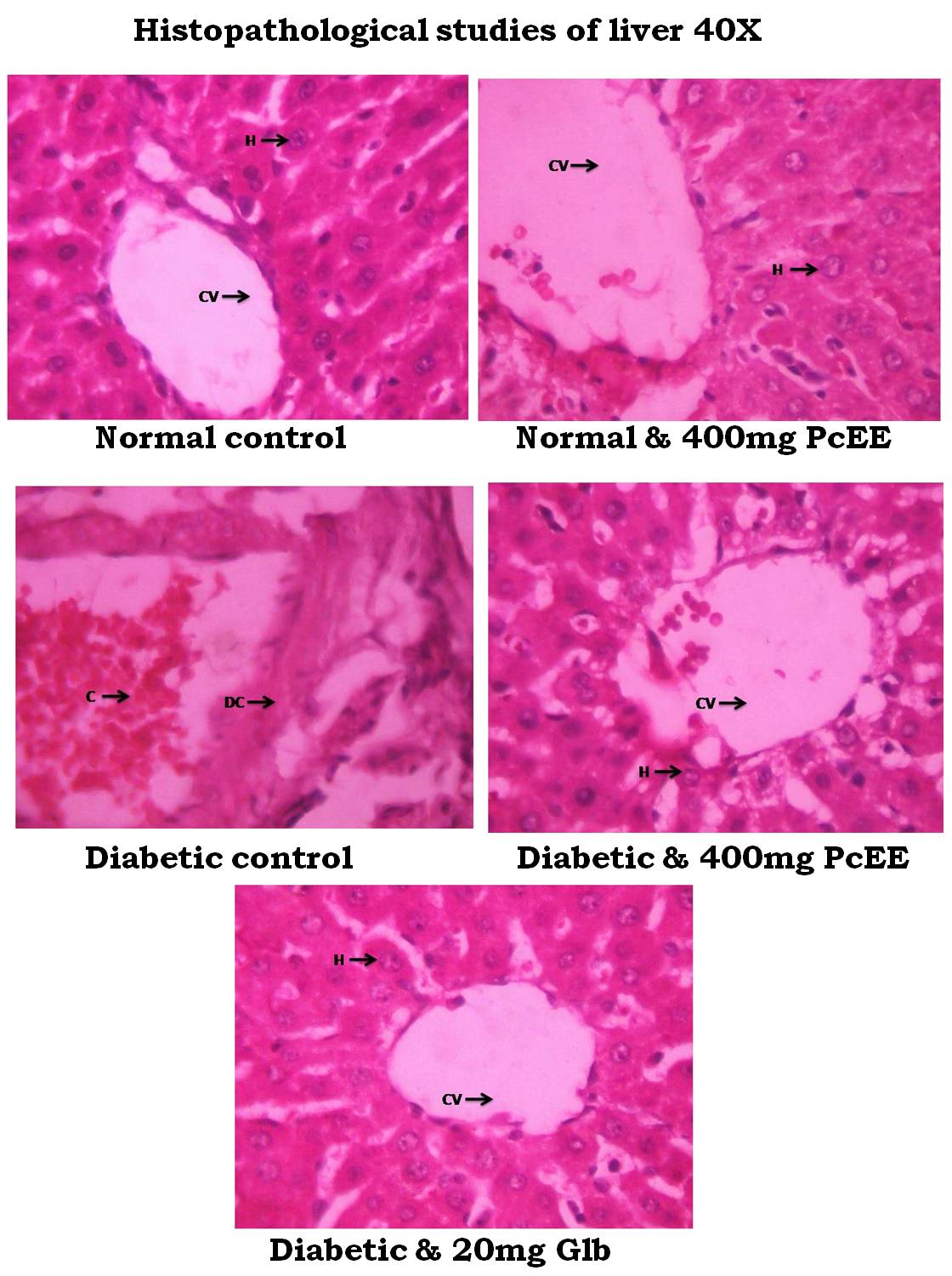 Histopathology of liver and kidney was studied in normal, diabetic and treated groups. The normal histological liver section shows the well arranged cells and clear central vein. In the diabetic group it shows the complete destruction of hepatocytes de generation of central vein and also shows fatty degeneration. Histopathological changes are restored near to normal in the PcEE treated group and are near to the Glb drug treated group (Fig. 1).