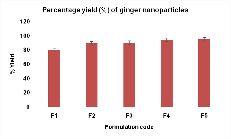 The percentage yield of ginger-loaded nanoparticles is depicted in fig. 3 and ranges from 80% to 95% for different formulations. It is therefore inferred that as the concentration of the polymer was increased, the percentage yield was also increased.