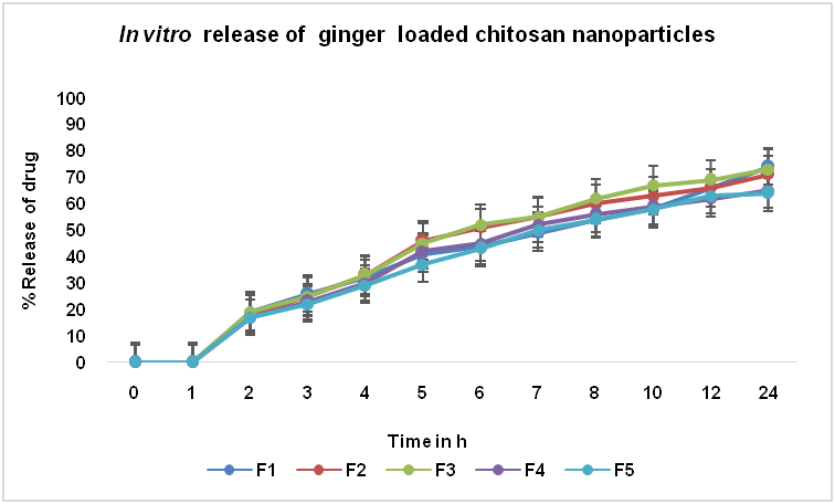 From the in vitro release data it was found that formulations F1 and F3 showed the best release of 74.21% and 72.86% respectively at the end of 24 h among all the five formulations of ginger loaded chitosan nanoparticles. F2 Formulation shows 70.73% of drug release at the end of 24 h. F4 and F5 show 64.83% and 64.75 %, respectively. The release rate was related to drug: polymer ratio. Increase of drug release was found as a function of the drug: polymer ratio. It was observed that the drug release decreased with an increase in the amount of polymer for each formulation. This may be because the release of drug from the polymer matrix takes place after complete swelling of the polymer and as the amount of polymer in the formulation was increased, the time required to swell was also increased (fig. 10).